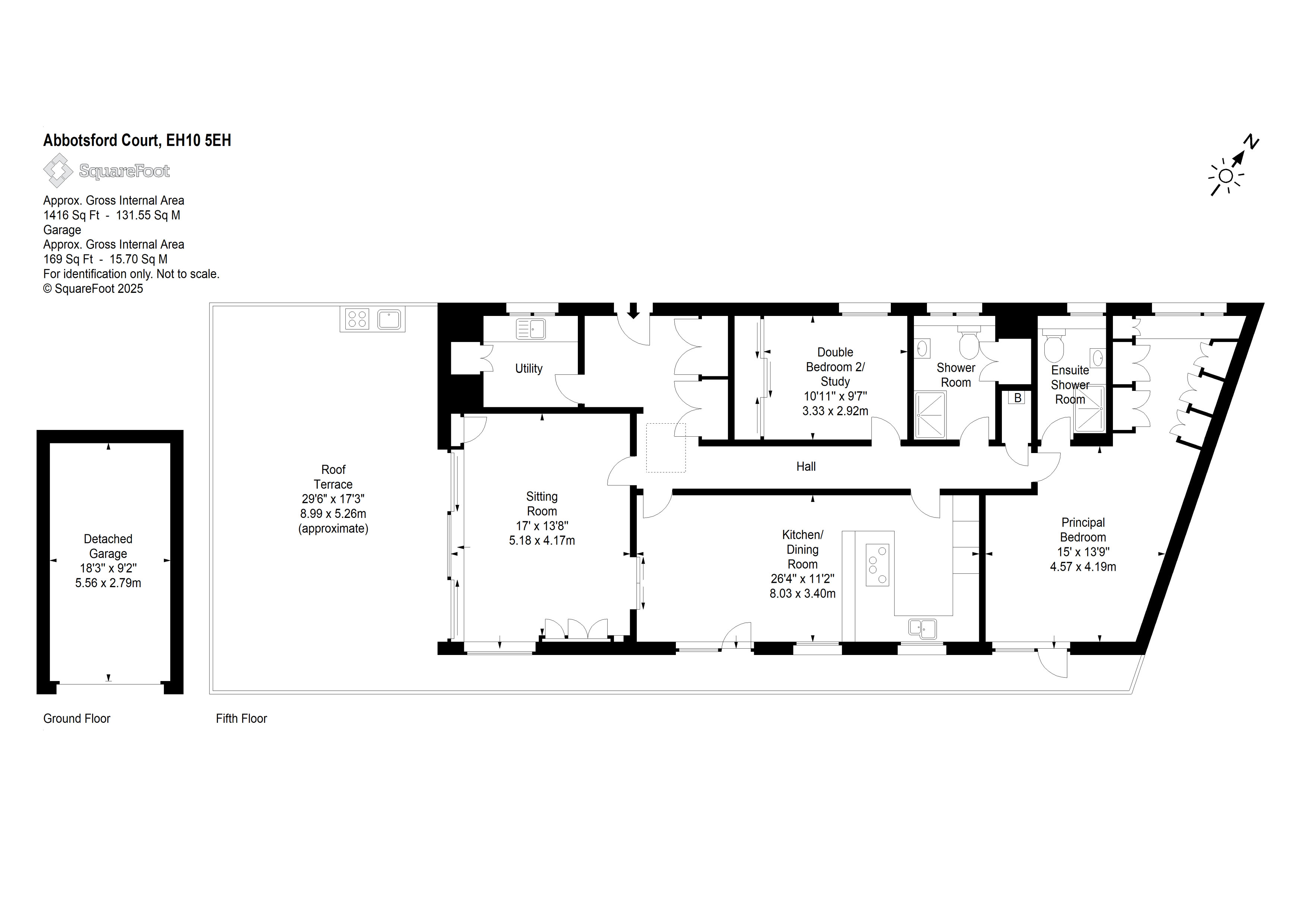 Shared secured entry. Lift & stairs to upper levels. Reception hall with extensive fitted storage. Utility room with fitted storage housing the automatic washing machine & tumble dryer. Fabulous living room with picture patio doors providing superb views to surrounding hills & across Edinburgh. Feature built in storage wall with wall-mounted television. Fantastic roof terrace with composite decking, feature lighting, outdoor kitchen with gas BBQ plumbed hot and cold water & fridge. Remote controlled blinds within living room. Attractive & generously proportioned dining kitchen (Kitchen International) with French doors to balcony. Breakfast bar with stools. Top of the range integrated appliances with Quooker hot water tap. Delightful master bedroom with extensive fitted storage, access to balcony with French door. Contemporary fitted ensuite shower room. Further double bedroom with fitted storage. Modern fitted shower room with built in storage. Gas central heating. Double glazing. Sound system through the main living areas & on roof terrace. Secured resident’s parking. Private garage with electric vehicle charging point. Beautifully maintained communal grounds.